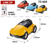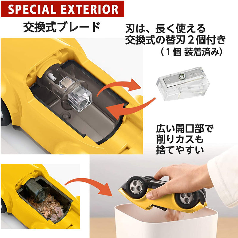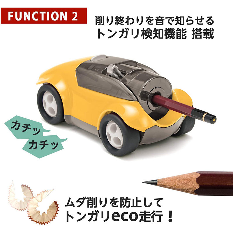 The Plus Racing Car pencil sharpener is an innovative pencil sharpener that adds a lot of fun to sharpening a pencil. Simply press and put the car and your pencil will be sharpened automatically. Equipped with a 1-way gear, it allows you to sharpen pencils not only by running forward but also by backing. The "Tongari detection function" will notify with a sound when the pencil is fully sharpened.