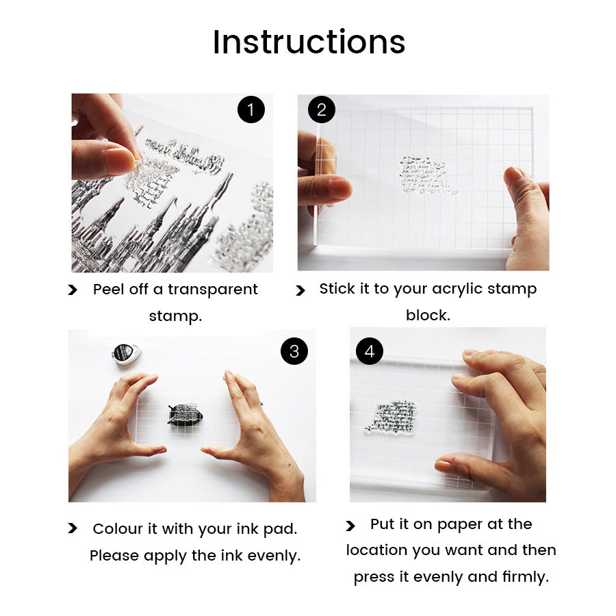1. Each stamp can be stuck to the transparent acrylic block. Gently peel the stamp off the plastic paper.
