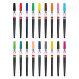 Pentel Art Brush Pens come in 18 colours: Black, Red, Blue, Green, Lemon Yellow, Brown, Orange, Pink, Sky Blue, Light Green, Turquoise, Olive Green, Pale Orange, Steel Blue, Grey, Yellow Orange, Sepia and Purple.