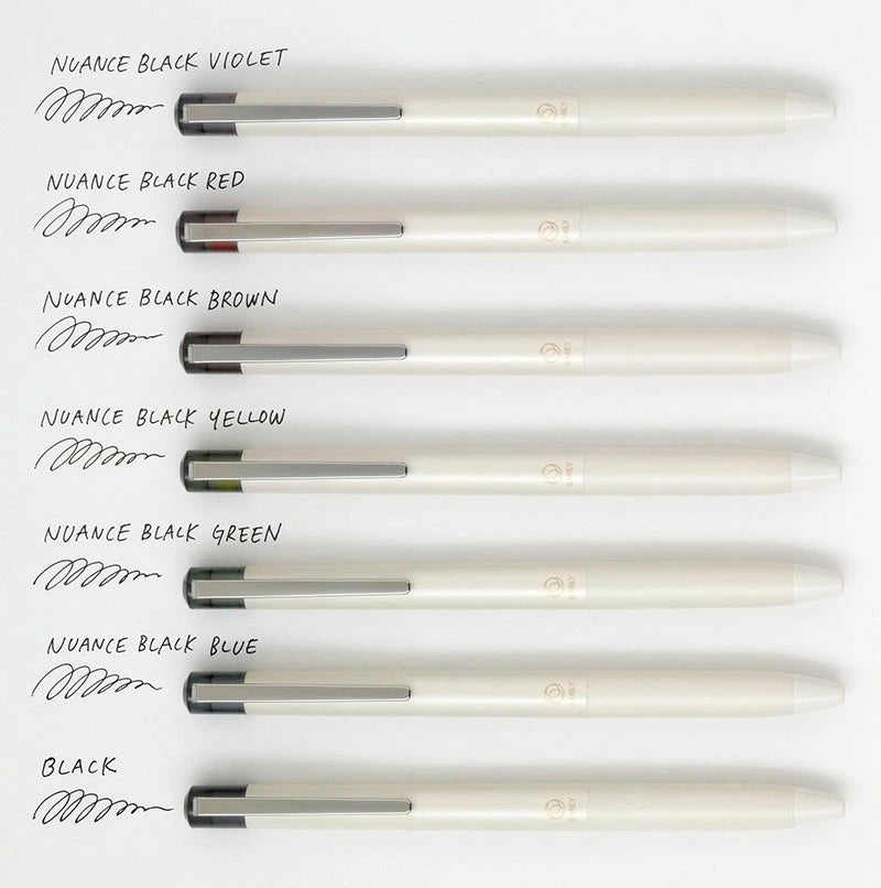 The New ILMILY Nuance Black from Pilot features a series of black and off-black inks. The pearl white pen barrel features a rubber grip and a metal clip button. The transparent colour indicator shows its ink colour at the end of the barrel. The ink formula from Pilot is vivid, water-resistant, and feather-resistant. The series comes in 7 ink colours, Black, Black Blue, Black Violet, Black Green, Black Red, Black Yellow, and Black Brown.